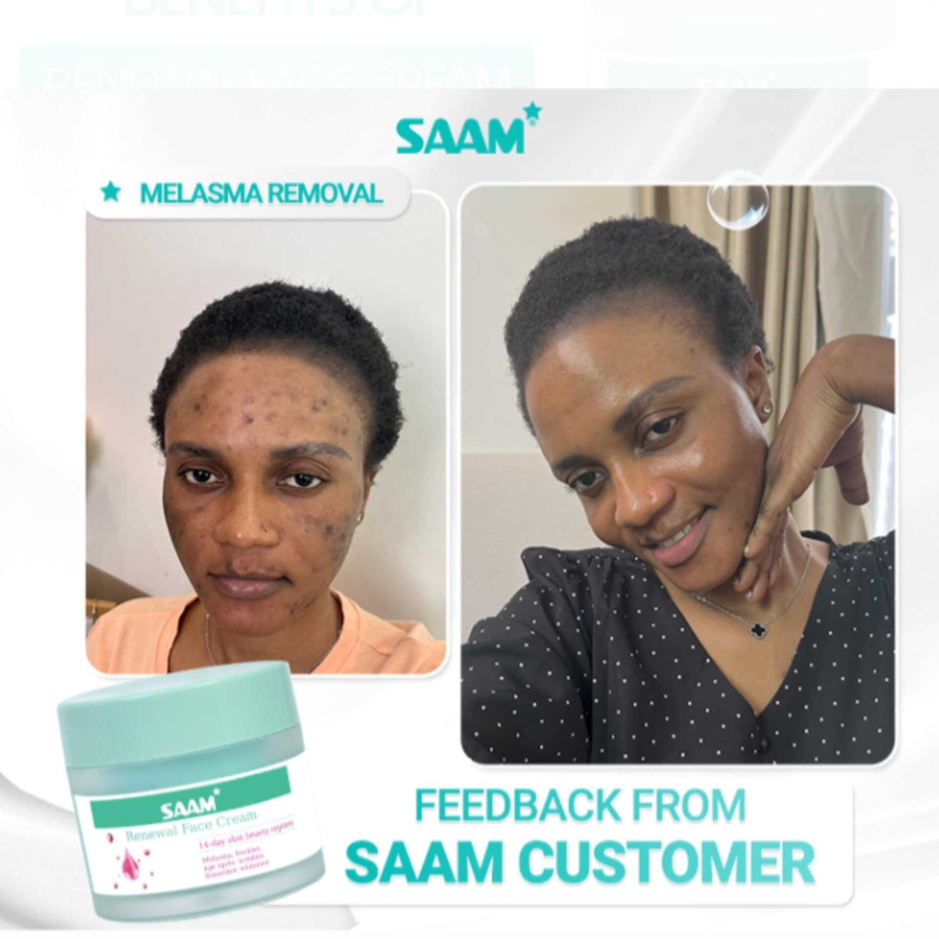 O Creme Facial Renovador SAAM é um produto exclusivo da SAAM, especializado no tratamento de melasma, sardas, manchas da idade e manchas escuras.